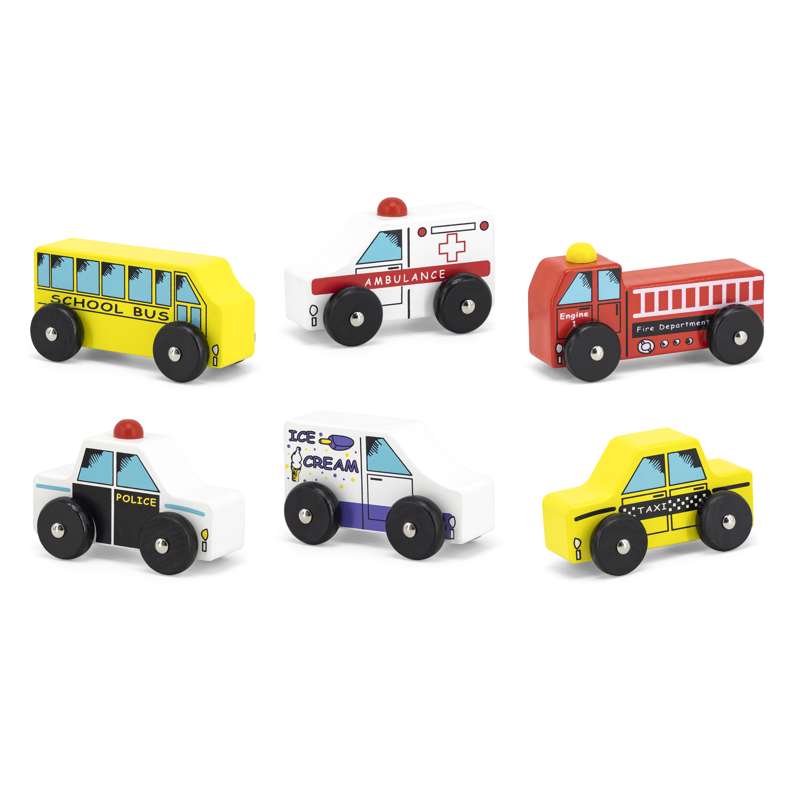 Fint sæt med 6 træbiler, der kan genkendes fra bybilledet. Mål: 11 x 7 cm.
