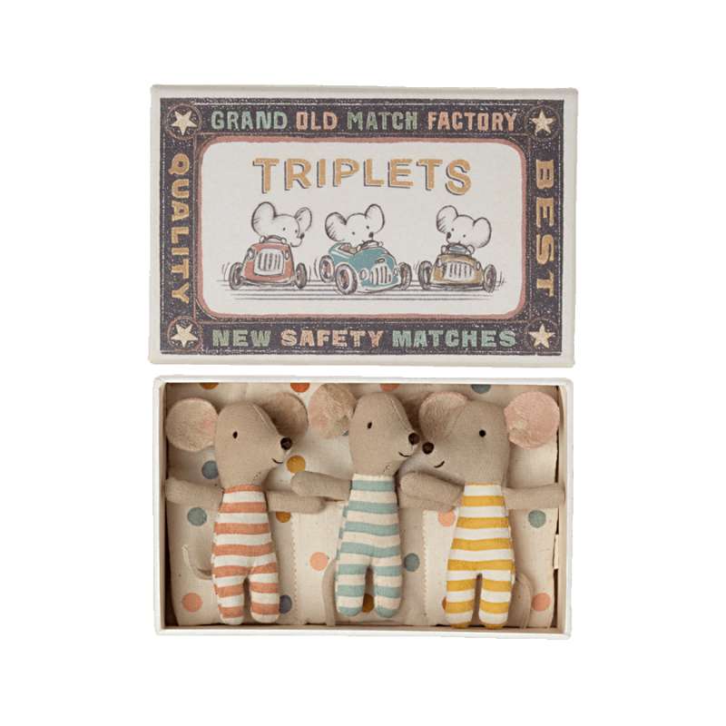 En klassisk Maileg-vare. Nu kan du have tre babymus på samme tid. Put forsigtigt trillingerne...
