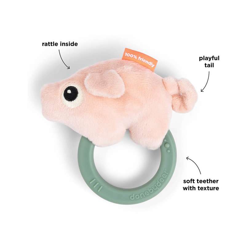 Sensoriske elementer som en rangle og forskellige teksturer vil stimulere dit barns hørelse og taktile...