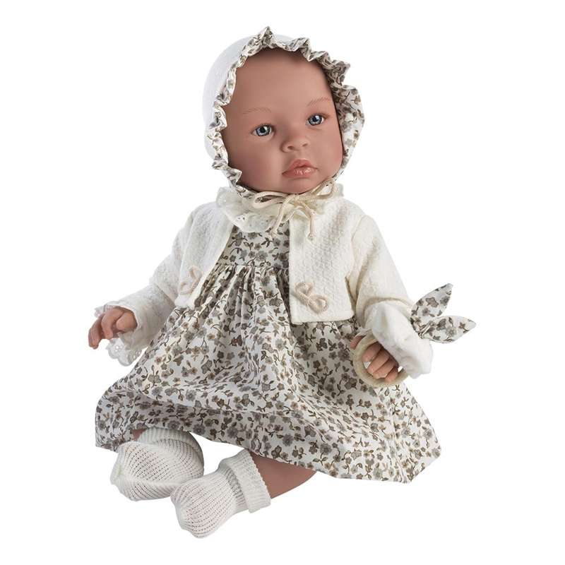Asi Leonora Dukke - 46 cm. - Brunblomstret Kjole og Creme Cardigan