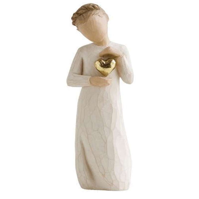 Smuk Keepsake figur fra Willow Tree, der forestiller en pige, der holder et guldfarvet hjerte....