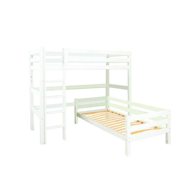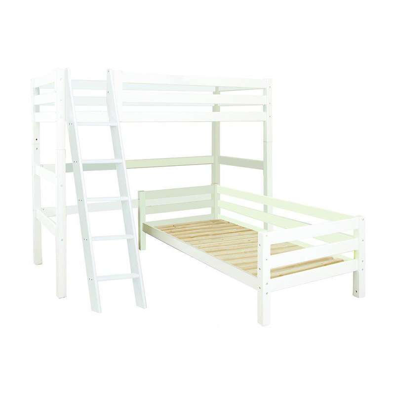 Smart vinkelkombination bestående af en ECO Luxury højseng med skrå stige og juniorseng, begge i...