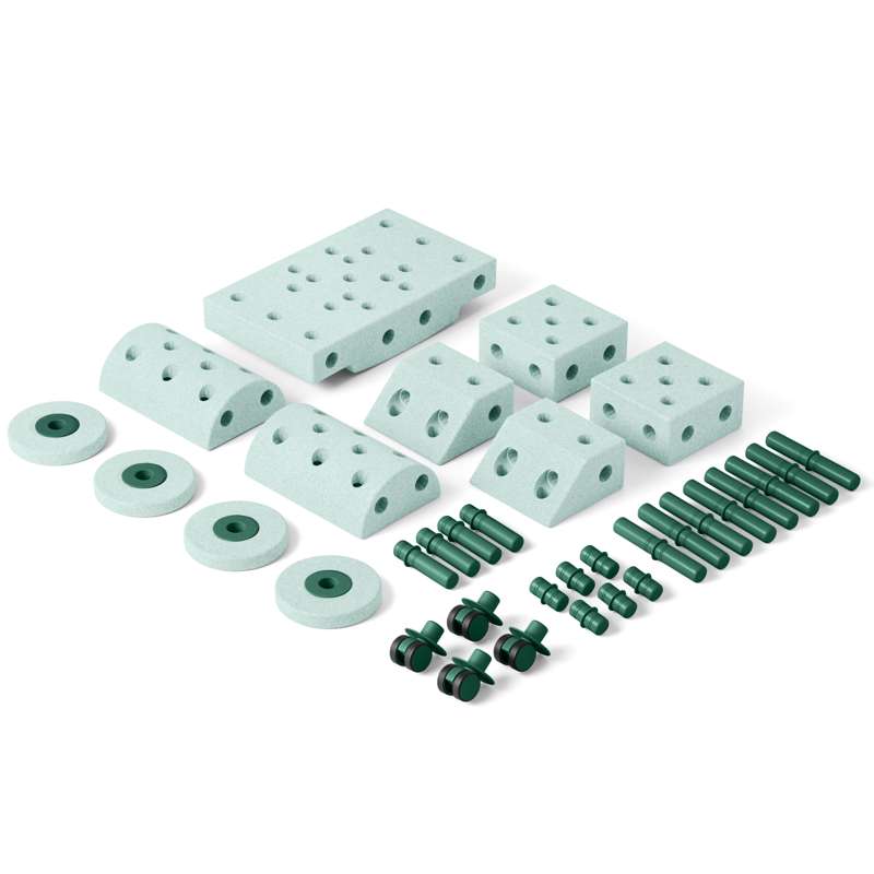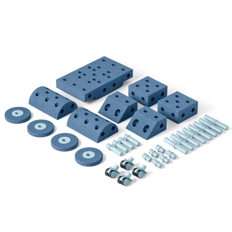 MODU købes i sæt og tilkøb og består af flere dele/klodser, der er fremstillet af EVA skum. Skummet er blødt hvis uheldet er ude, men hårdt nok til at det ikke er eftergivende i legen, og når klodserne sættes sammen.