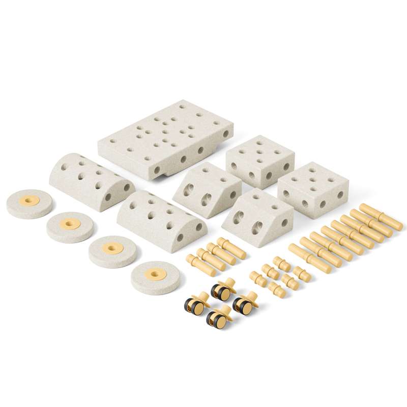 Klodserne kommer alle i en diskret lysegrå farve, og kan sammensættes på kryds og tværs via de små huller i klodserne, med de farverige connectors. Således kan du og dit barn bygge et utal af kreationer - afhængig af hvor legen og fantasien bærer jer hen. MODU kommer desuden med drejehjul, så alle kreationer også kan få fart på og krudte de små poder af.