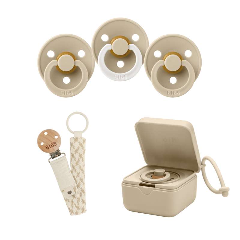 Denne bundle består af 3 stk. BIBS Rund Colour sutter i str. 2, en suttesnor og en sutteboks med plads til 3 sutter.