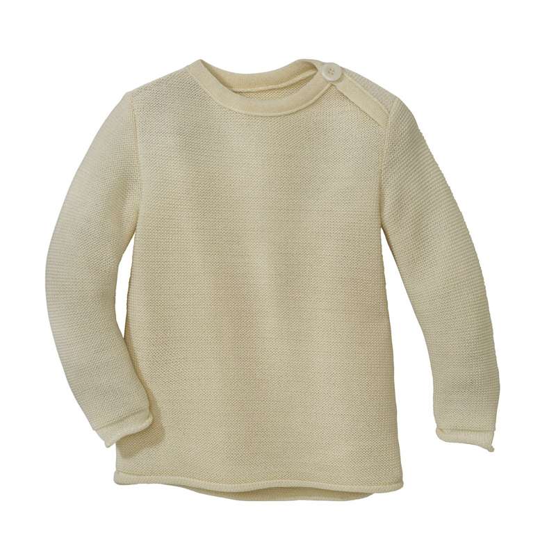 Disanas karakteristiske venstrestrik lavet af fin merinould gør den til en absolut favorit blandt alle børn. Takket være den praktiske snitkrave lukkes den nemt og varmer om halsen. Knaplukningen gør det desuden meget nemt at tage trøjen af og på.