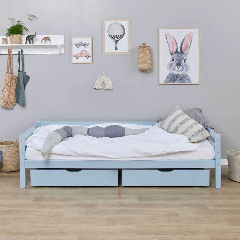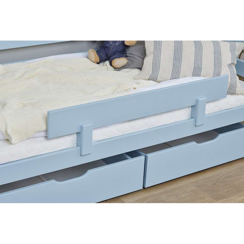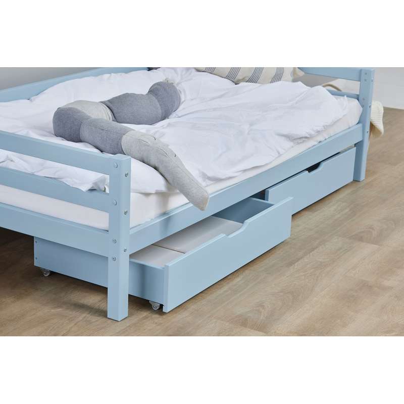 Udnyt pladsen under sengen, til opbevaring, med et smart skuffesæt fra Hoppekiks. Skuffesættet består af 2 store brede skuffer med hjul, så de nemt trilles frem og tilbage under sengen. Skufferne er rummelige, så der er god plads til opbevaring af legetøj, sengetøj eller måske noget helt andet. Sættet kommer i en flot blå farve, men fås i flere flotte farver som passer til sengene fra Hoppekids.