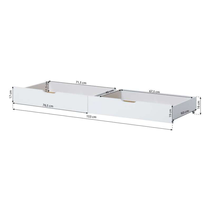 Varianten 70x160 cm har en ydre størrelse på B153xH19xD60 for begge skuffer.