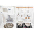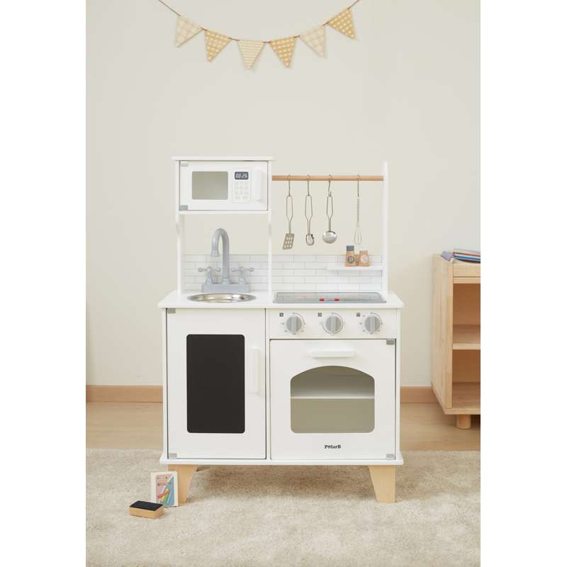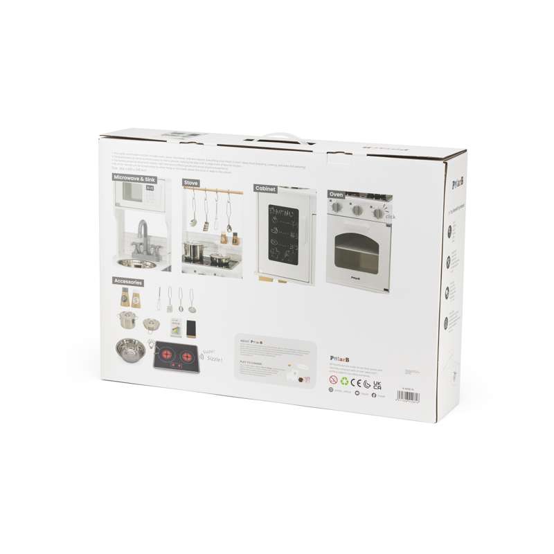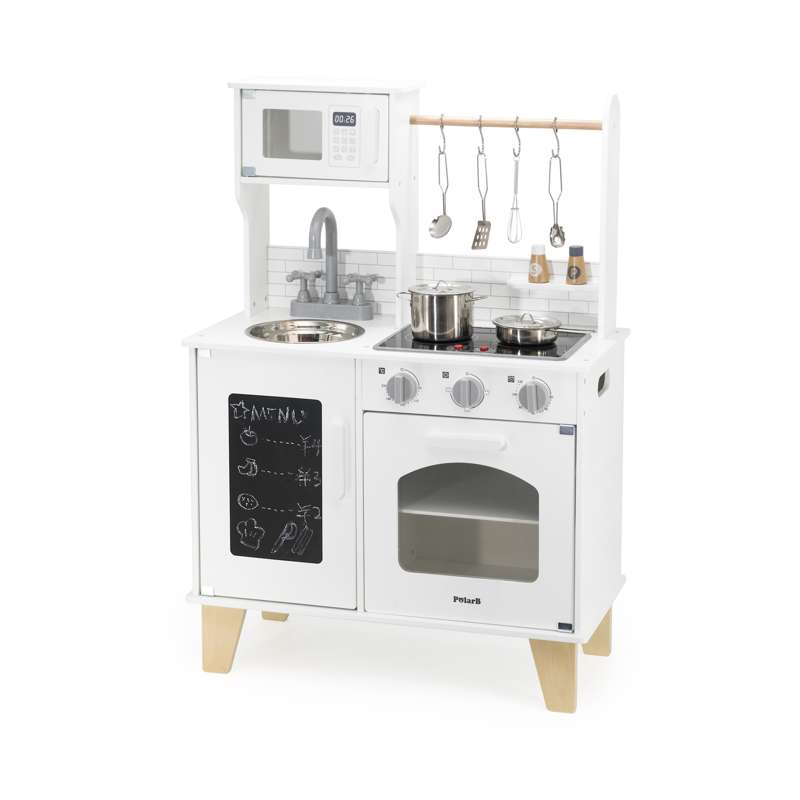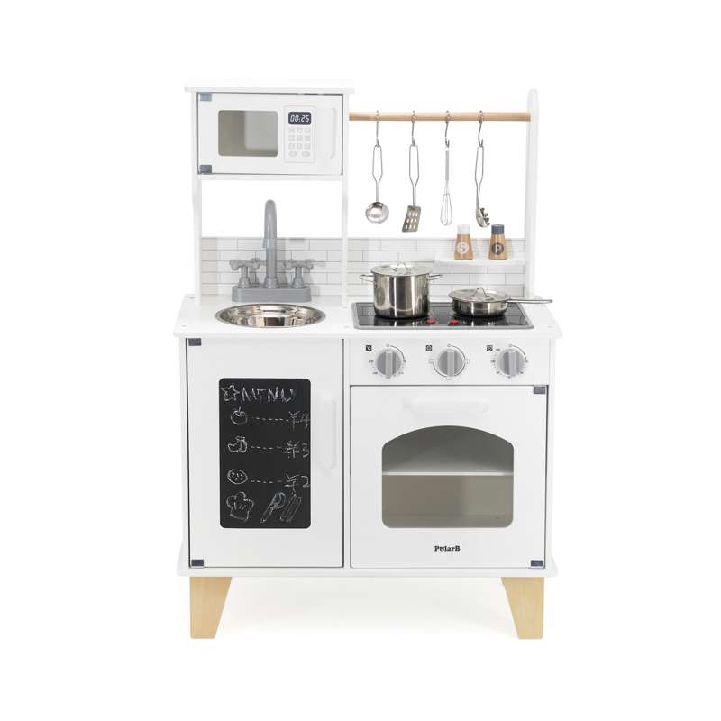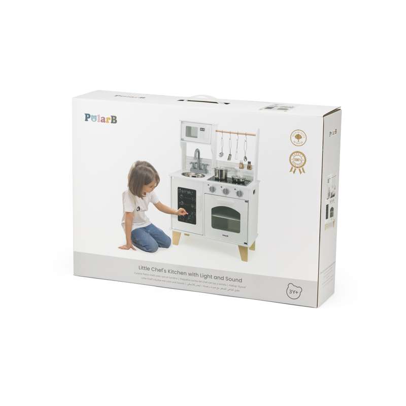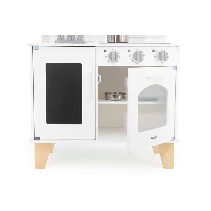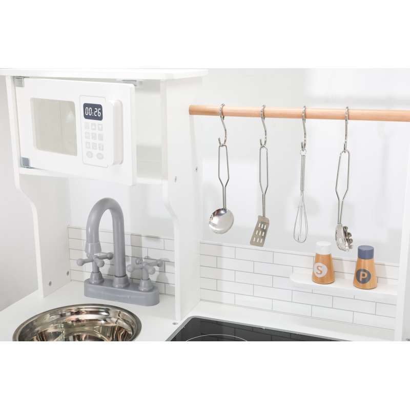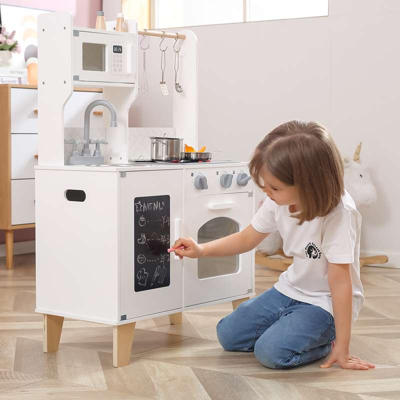 Med realistiske detaljer som kogeplade med lys og lyd, drejeknapper og ovnlåge, får barnet en leg, der både engagerer og inspirerer. Den medfølgende kridttavle er perfekt til at skrive dagens menu eller små beskeder, mens tilbehøret – gryder, skeer, krydderibøsser og meget mere – gør legen komplet fra første dag.