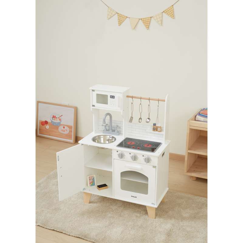 Legekøkkenet er fremstillet i robust træ og passer ind i både børneværelset og stuen med sit stilrene design. Det er i en praktisk højde, så barnet let kan nå alle elementer og lege selvstændigt – hvilket styrker finmotorikken, fantasi, sprog og sociale færdigheder.