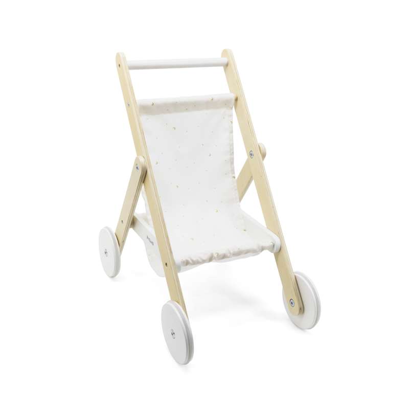 Vognen er lavet med et solidt træstel og har en praktisk opbevaringskurv under sædet – perfekt til små tilbehør, dukketæpper eller legetøj. Den fine stjerne- og måneprint gør vognen ekstra charmerende og dekorativ på børneværelset.