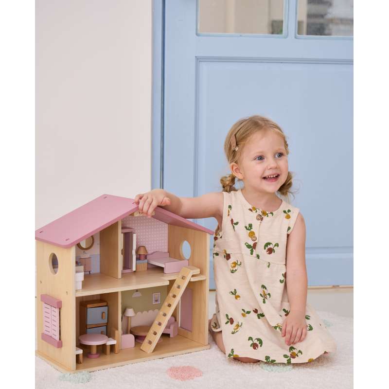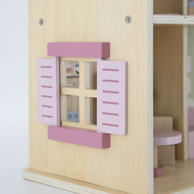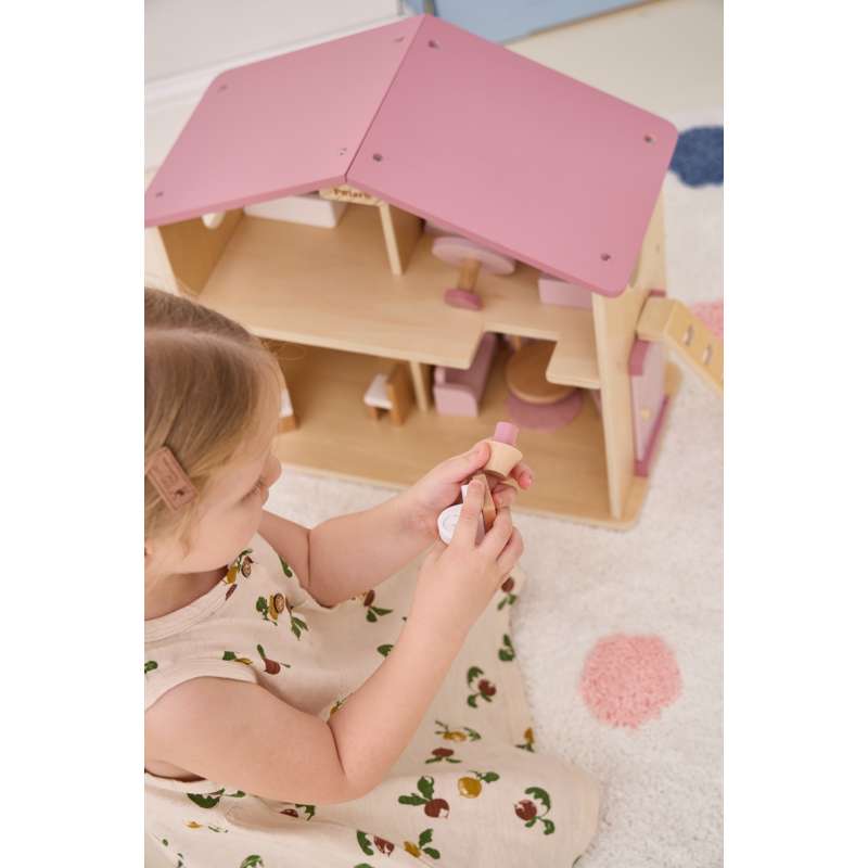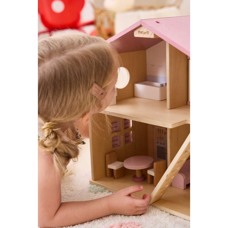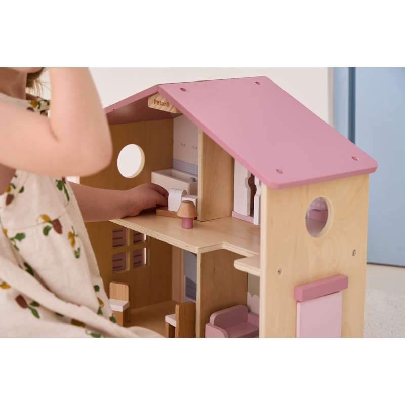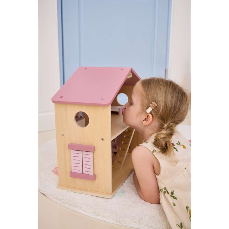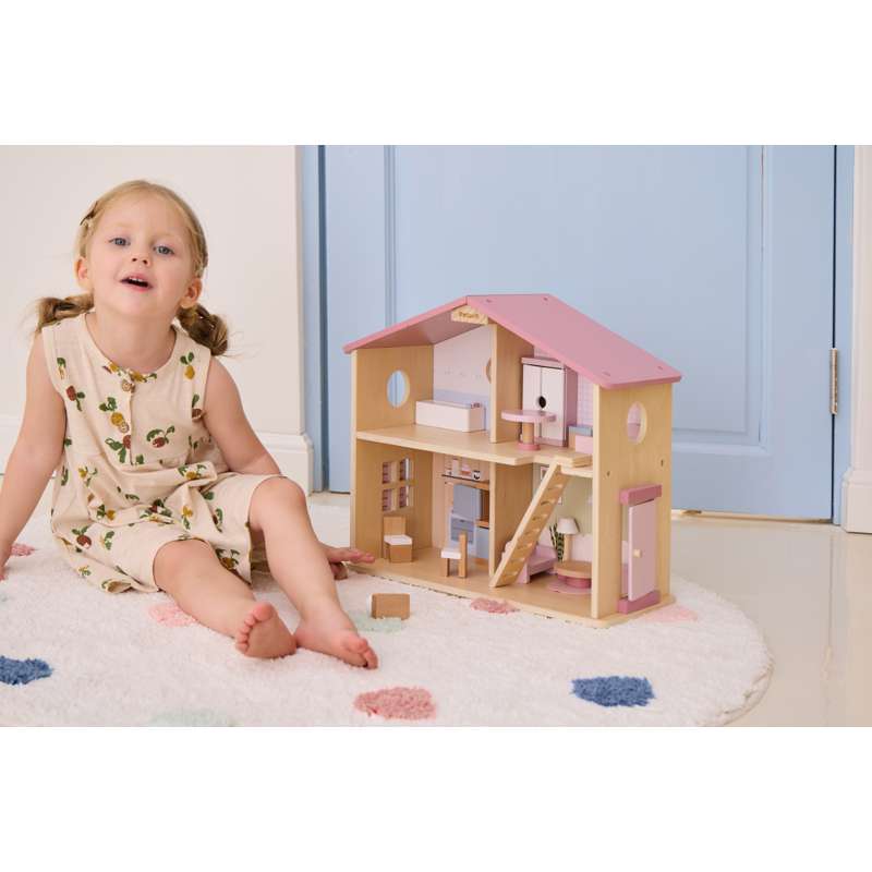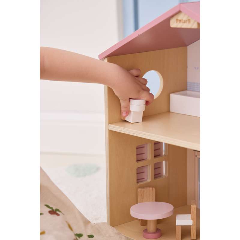 Dukkehuset er ideelt til både selvstændig og fælles leg – og passer flot ind på børneværelset med sit charmerende udtryk og gennemtænkte indretning.