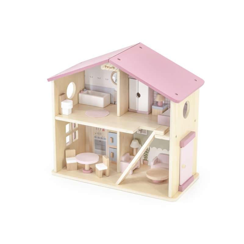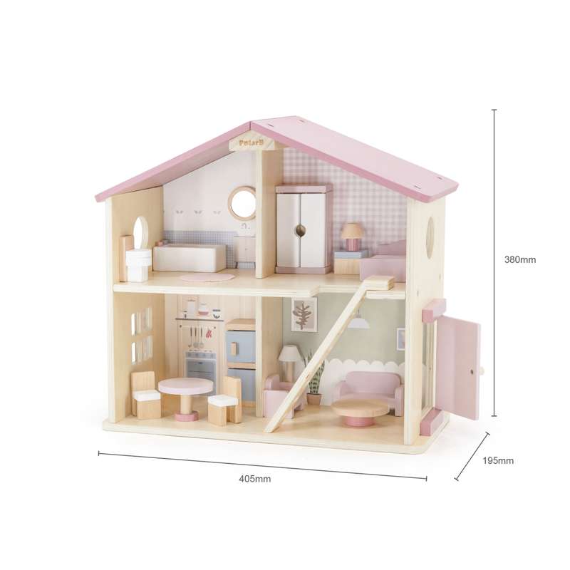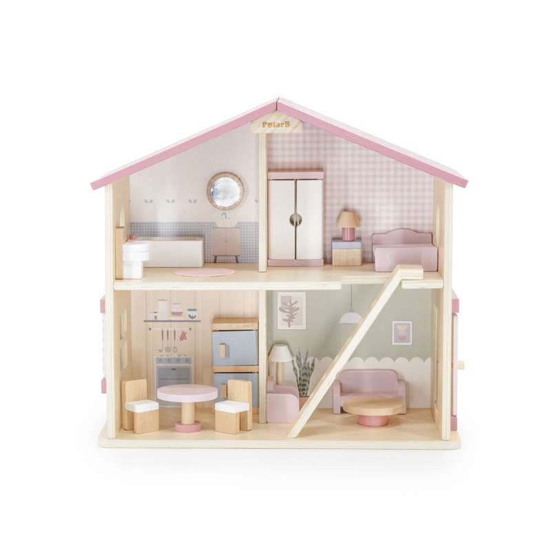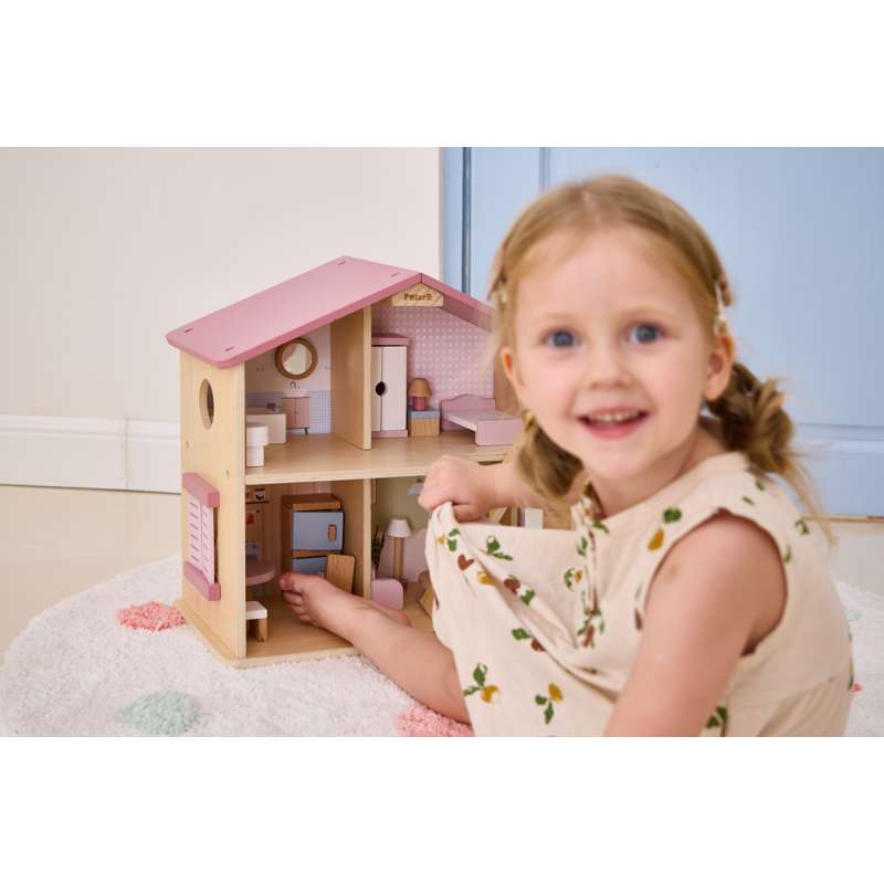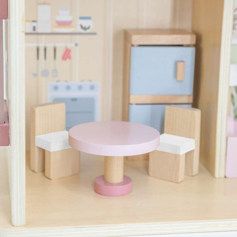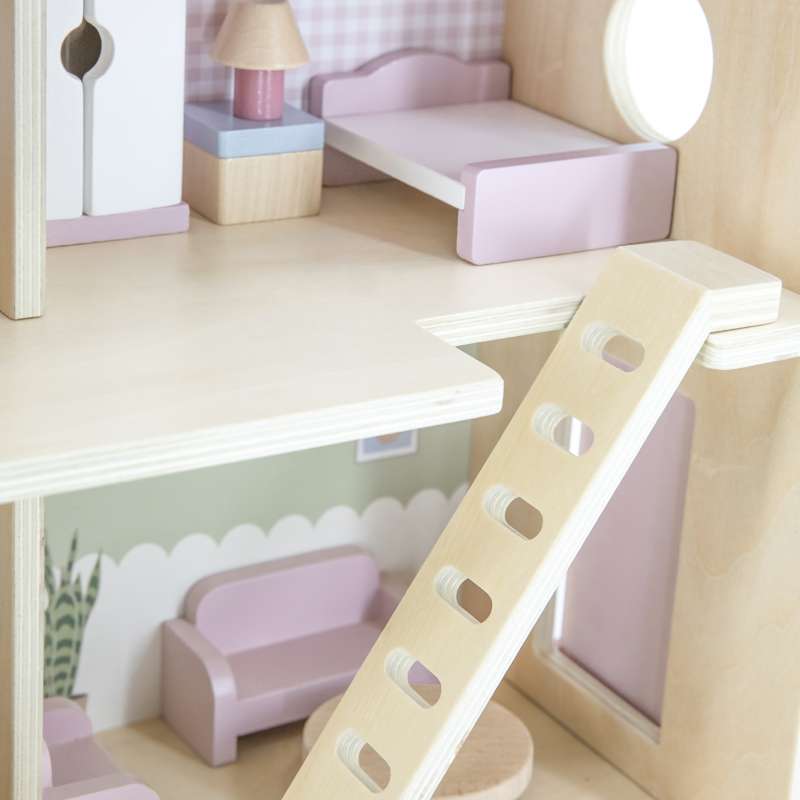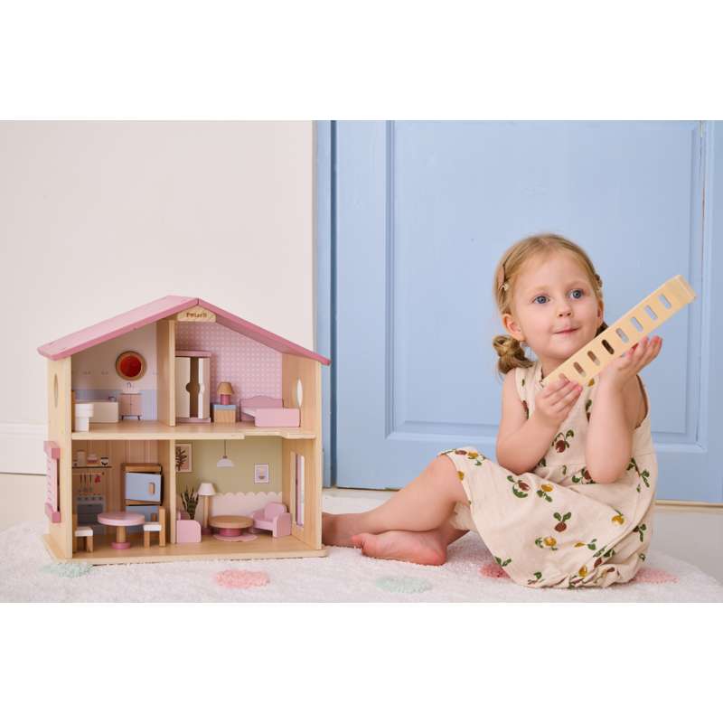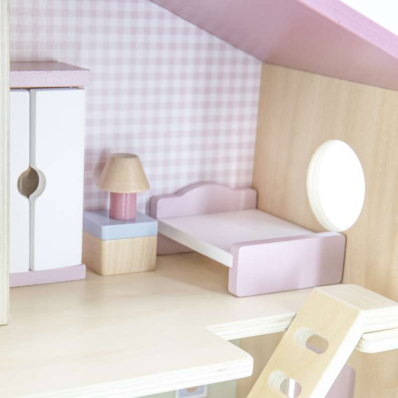 Dukkehuset er ideelt til både selvstændig og fælles leg – og passer flot ind på børneværelset med sit charmerende udtryk og gennemtænkte indretning.