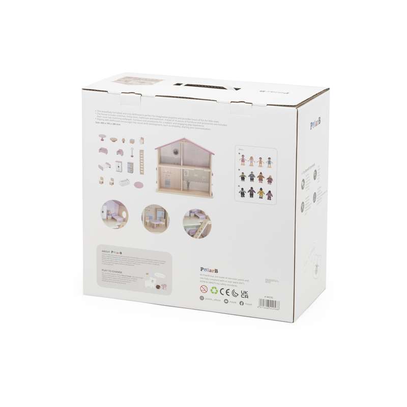 Dukkehuset indeholder fire detaljerede rum: køkken, stue, badeværelse og soveværelse – alle med matchende tapet, møbler og tilbehør, der giver en virkelighedstro legeoplevelse. I alt medfølger 16 dele, herunder møbler og små accessories.