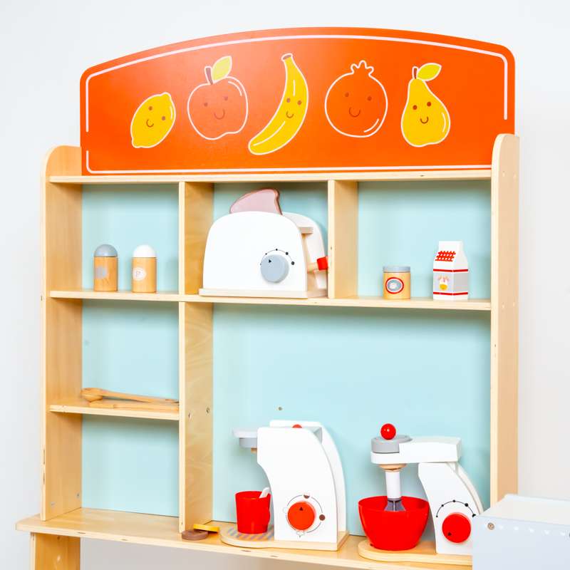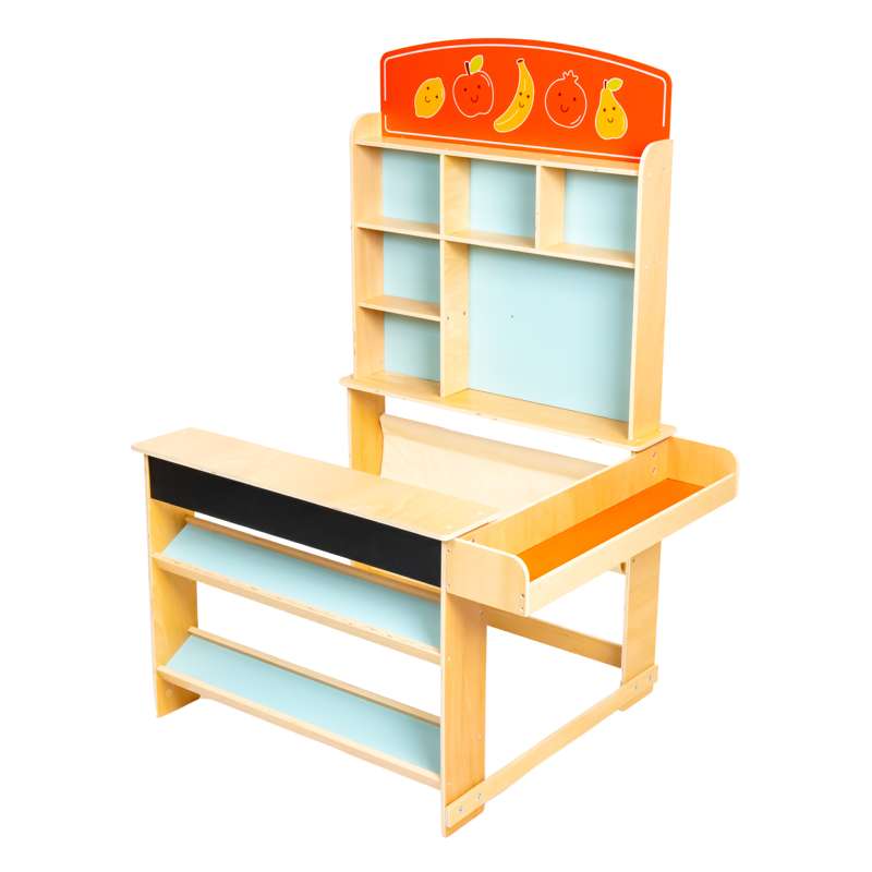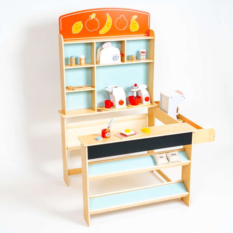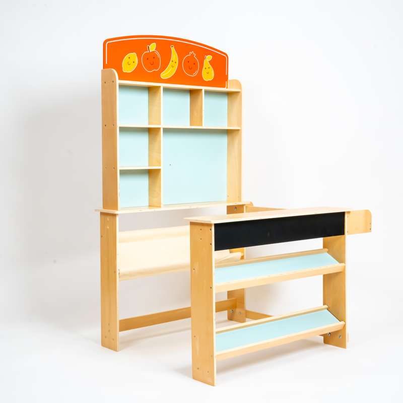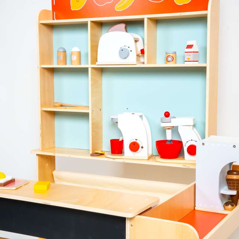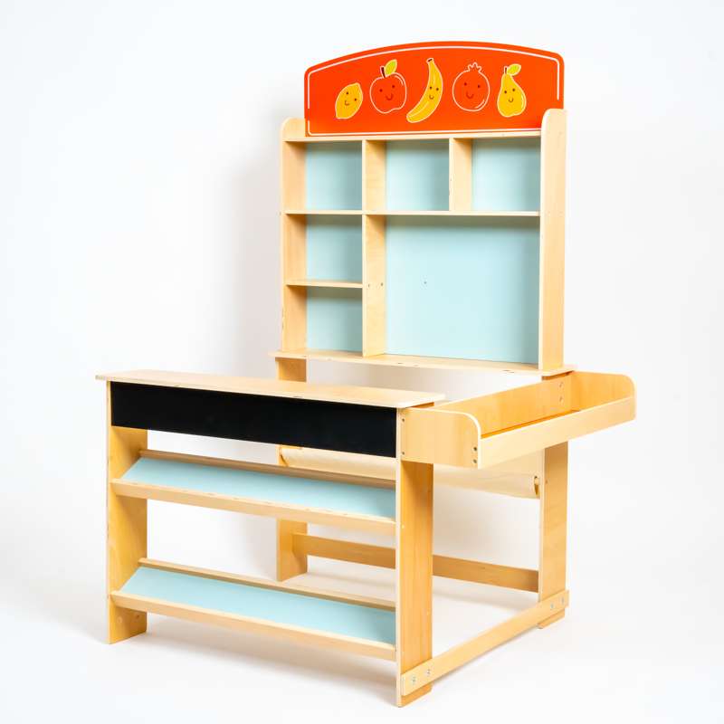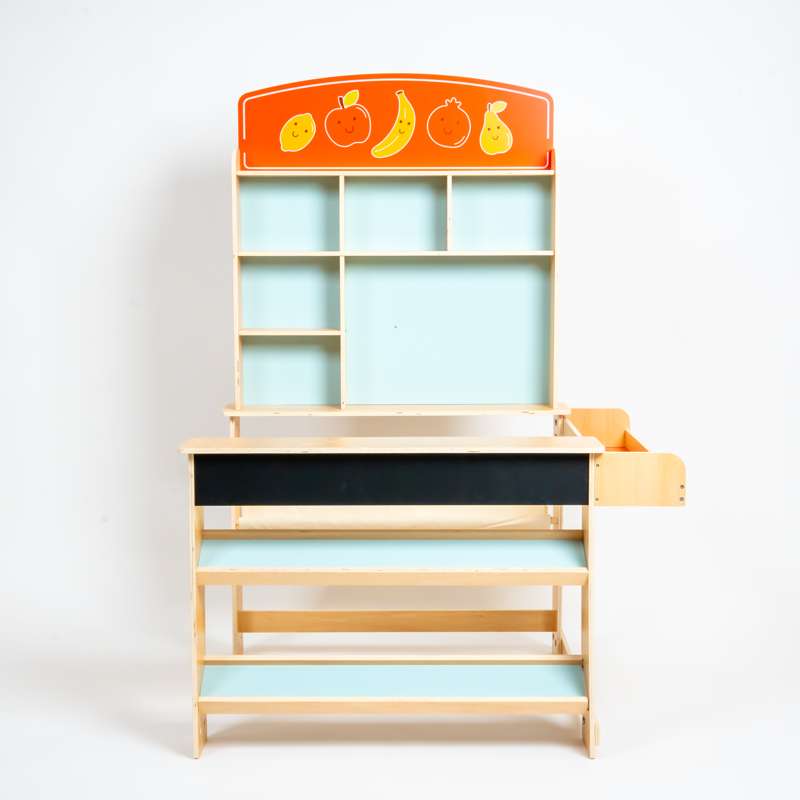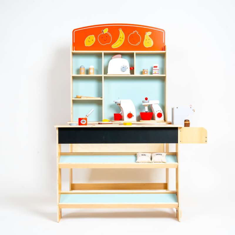 Fyld købmandsboden med legemad og andre varer og lad barnet sælge ud og lege købmand.