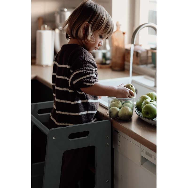 Kid'oh Læringstårn i træ i grå er et multifunktionelt møbel, designet til at give børn en sikker platform til at deltage i daglige aktiviteter i køkkenet. Læringstårnet er lavet af solidt træ og kan justeres i højden for at følge med barnets udvikling. Det er ideelt til at fremme børns selvstændighed og motoriske færdigheder, da det giver dem mulighed for at deltage i aktiviteter som madlavning eller håndvask. Et stilrent og praktisk valg til ethvert hjem med småbørn.