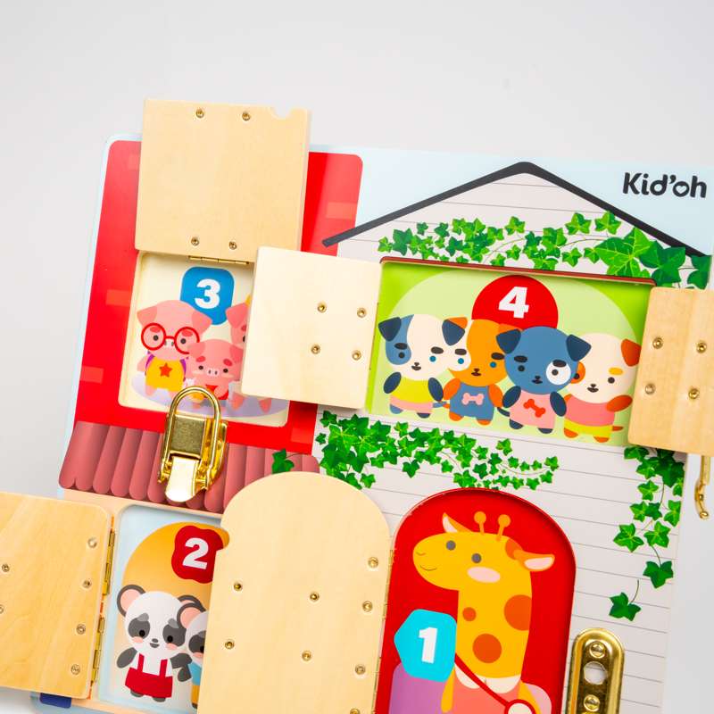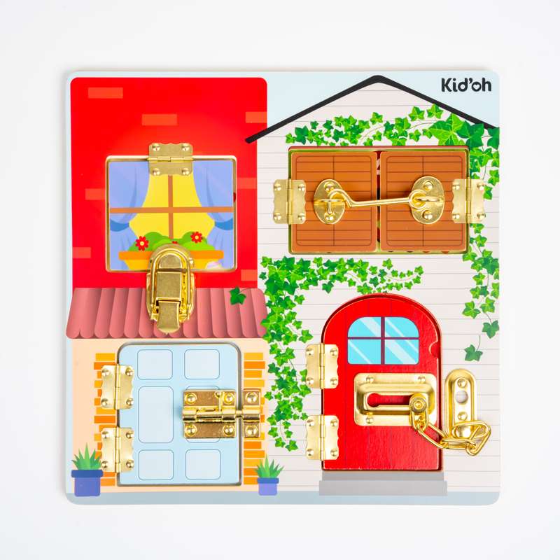 Låsebræt i træ fra danske Kid'oh. Låsebrættet (også kendt som pilfinger bræt) er et perfekt stykke legetøj til at styrke barnets motoriske færdigheder.