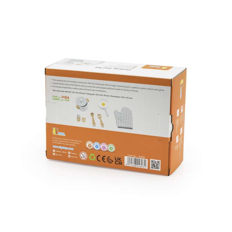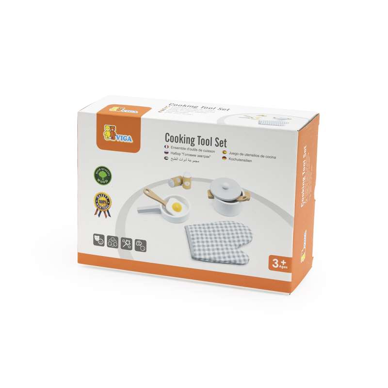 - Dette madlavningssæt indeholder en gryde med låg, en stegepande med et spejlæg, 2 krydderiglas, en spatel, en ske og en ovnhandske.