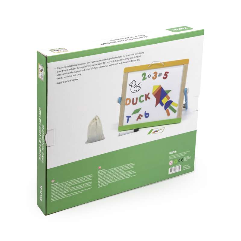 På den ene side er der en klassisk kridttavle og på den anden side finder du en magnetisk whiteboard tavle.