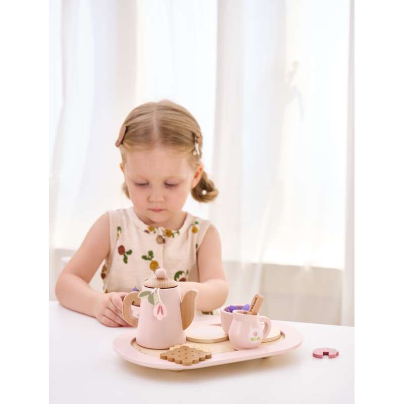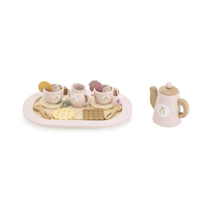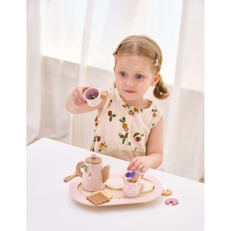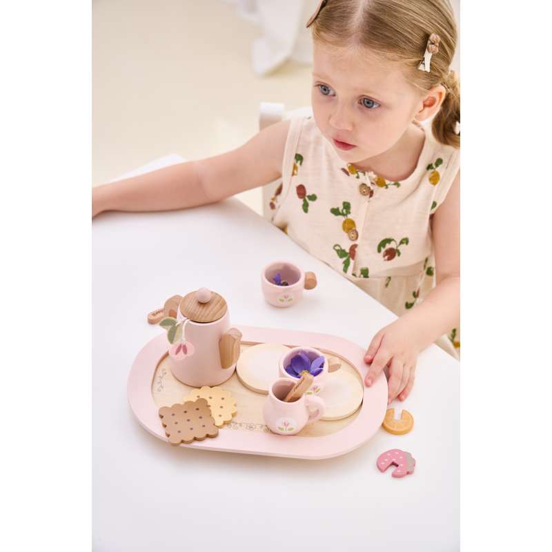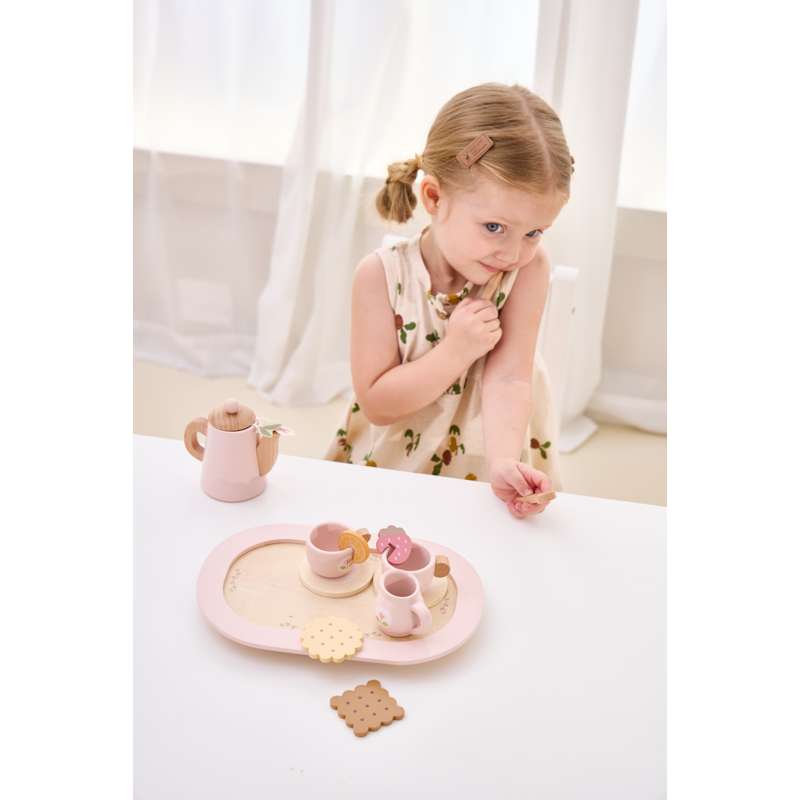 Med dette charmerende tesæt er børnene klar til at invitere til deres egen hyggelige tefest! Sættet indeholder tekande, kopper og coasters, mælkekande, tebreve, skeer, citron- og jordbærskiver, småkager og serveringsbakke – alt, hvad der skal til for en fantasifuld legestund. Perfekt til rolleleg og til at styrke barnets sociale færdigheder gennem leg.