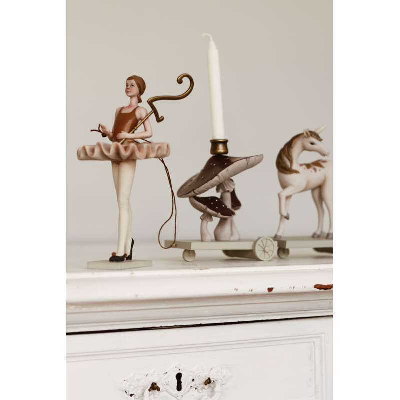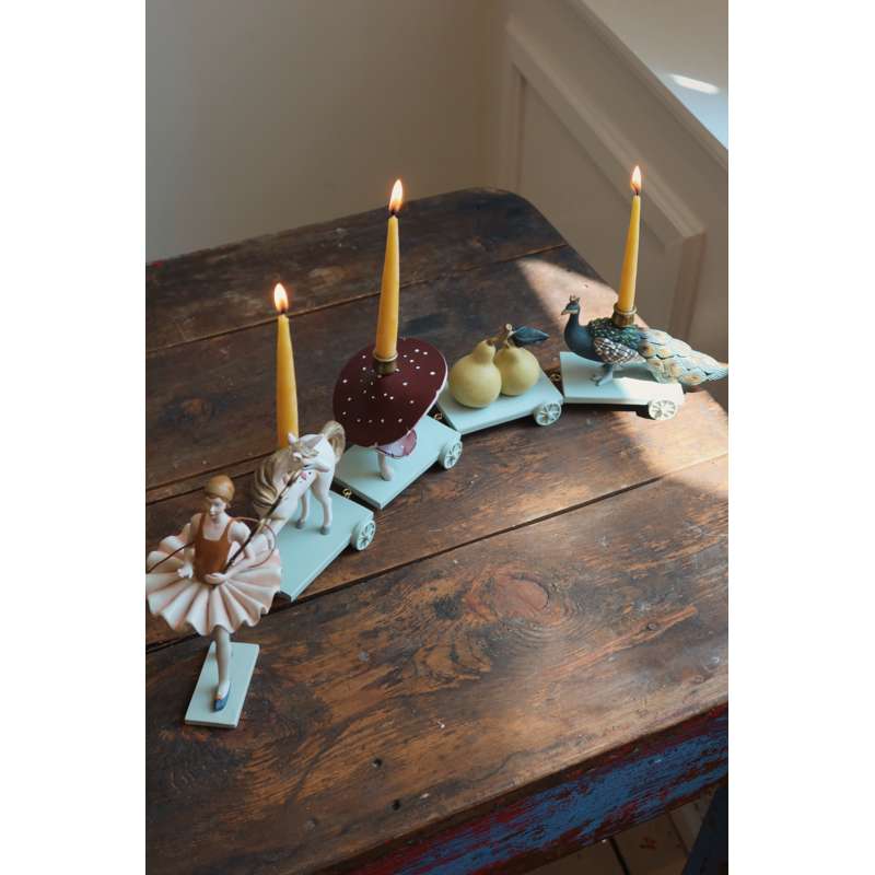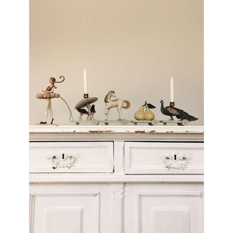 Ballerina går med svampe, en enhjørning, pærer og en påfugl.