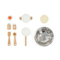 * Komplet redskabssæt: stegepande med spejlæg, gryde, spartel, ske samt salt- og pebersæt.