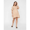Kjolen er kort, med v-hals og korte ærmer. Der er rynkedetaljer under brystet og flæser ved nederste kant og ærmer.