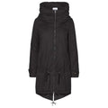 Der er en skjult hætte indeni kraven, to skrå lommer foran, en brystlomme med lynlås, snor under maven og i nederste kant, stropper ved ærme-åbninger og slids nederst bagpå.