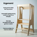 - 10 cm bredere end de fleste læringstårne: giver ekstra plads og stabilitet, så barnet kan stå trygt og bevæge sig frit.