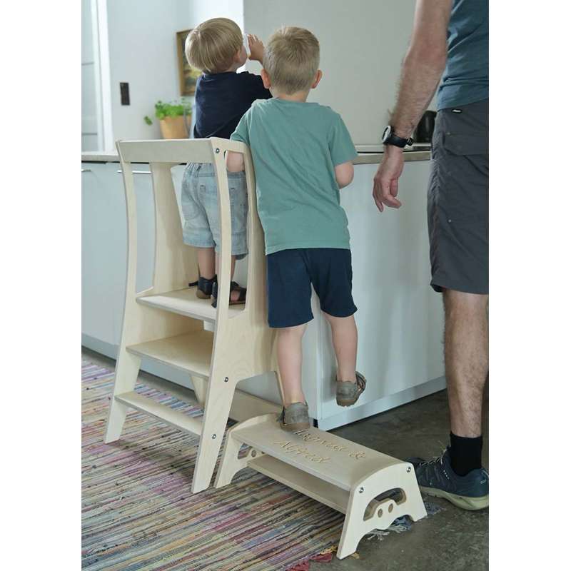 - Kan deles mellem søskende pga. 2 faste og 1 placérbart trin: det nederste trin og den brede ståplade er faste elementer. Det øverste 3. trin, er en plade, der med en enkelt hånd kan vippes op som frontplade af en voksen eller barnet selv (fra barnet er ca. 2 år). Dette giver et højdejustérbart tårn, der kan deles af søskende.