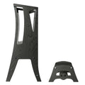 - Kan deles mellem søskende pga. 2 faste og 1 placérbart trin: det nederste trin og den brede ståplade er faste elementer. Det øverste 3. trin, er en plade, der med en enkelt hånd kan vippes op som frontplade af en voksen eller barnet selv (fra barnet er ca. 2 år). Dette giver et højdejustérbart tårn, der kan deles af søskende.