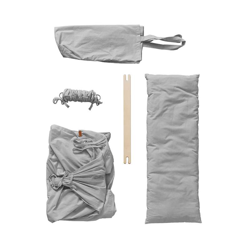 Slyngevuggen er blød og komfortabel og består af 100% økologisk bomuld og kommer med en madras med fyld af 100% ren uld, lagen, baldakin/myggenet og fjeder. Slyngevuggen kommer med en karabinhage skruelås, så du kan montere slyngevuggen direkte i den medfølgende fjeder. Karabinhagen er isoleret med gummi, for at sikre mod eventuelle metalsplinter.