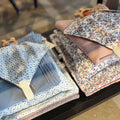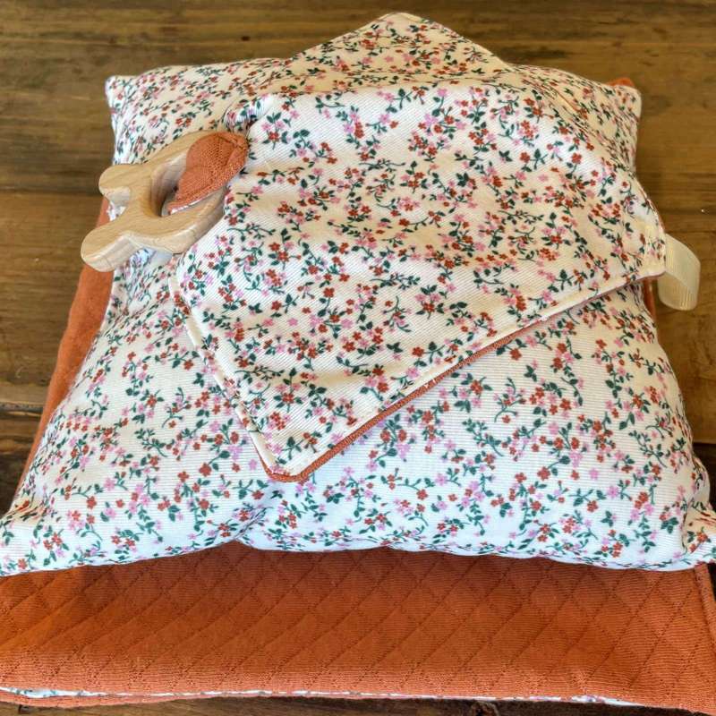 Sættet består af en småblomstret pude og et vendbart tæppe med blomsterprint på den ene side og ensfarvet quilt på den anden.