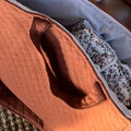 Pusletasken har to forlommer og passer til alle Leo, Leonora, Pablo og Maria dukker fra Así og fås i to varianter, her med stoffer i rustfarvet og blomsterprintet jersey.