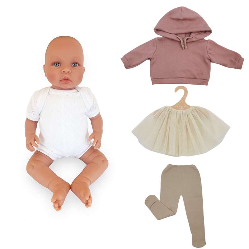 Leo / Leonora kommer med en hvid, hulmønstret bodystocking på, og vi har i denne sampak nøje udvalgt nogle af de mest populære tøjstykker, sammen med dukken. På den måde er du 'køreklar' så snart dukken lander. Garderoben kan naturligvis udvides over tid, med mere af det smukke dukketøj og -tilbehør fra Memories by Asi eller Asi.