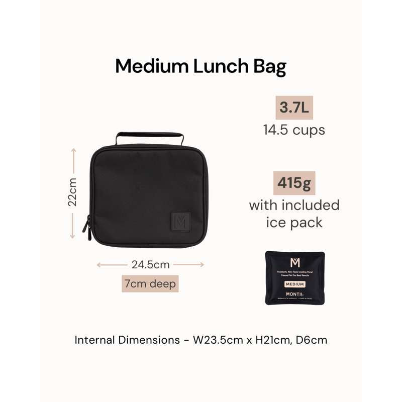 Køletasken er med polstret håndtag og har foruden madkasser også plads til køleelementer og tilbehør. Der medfølger også et MontiiCo 2.0 køleelement i str. Medium.