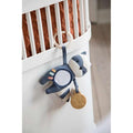 Rebel kommer i den flotte blå farve "bramble blue" og med lyse detaljer i ansigtet, på halen og kroppen. De lyse detaljer er lavet af blødt velour. Aktivitetslegetøjet holder barnet beskæftiget og hjælper med at stimulere sanserne. På maven har vaskebjørnen et lille spejl, så barnet kan se sig selv. I den ene arm holder Rebel en C-ring i plast, som gør at du let kan fastgøre legetøjet, så det er inden for rækkevidde for nysgerrig små hænder og øjne. I den anden arm er et agern med knitrepapir i samt en bidering, som vil hjælpe på kløende gummer under tandfrembrud.