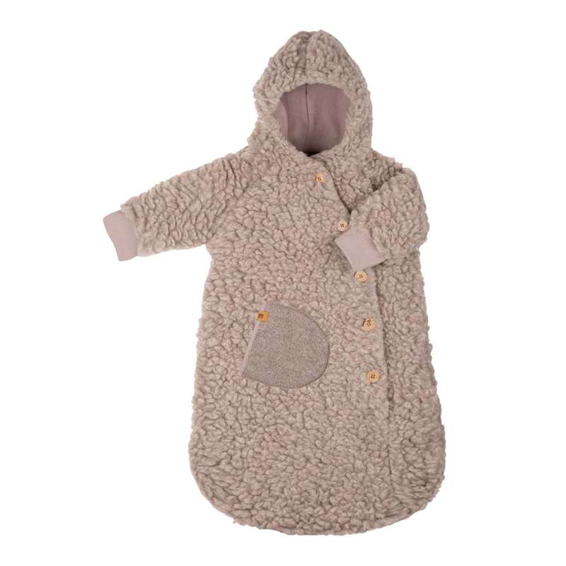 Soveposen med hætte (hætte foret med jersey) i 85% økologisk uld og 15% Tencel plys. Den integrerede hætte beskytter barnets hage og fungerer som vindfang i nakken. Manchetterne er farvekoordinerede og lavet af økologisk bomuldsjersey.