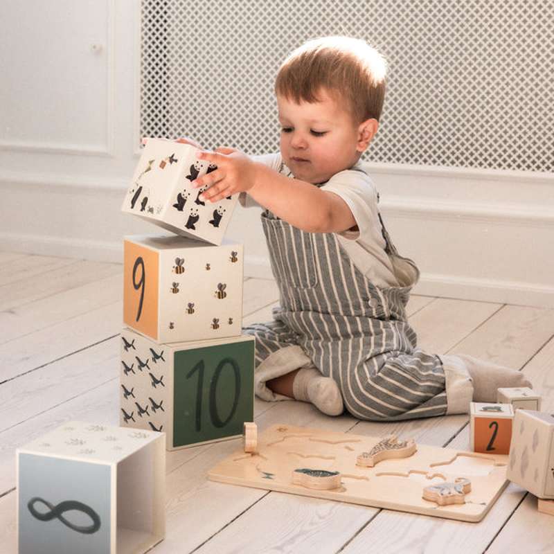 Stabelkasserne er designet i Danmark og kommer i en fin æske, der er flot på gavebordet til en 1-års fødselsdag.