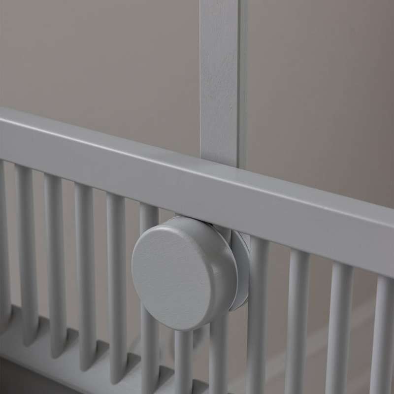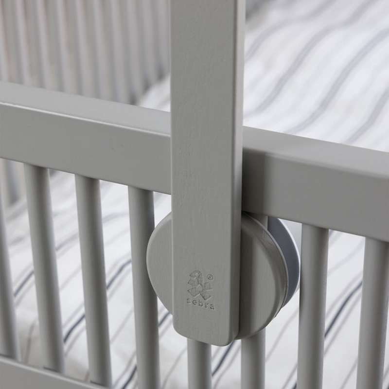Holderen er nem at montere på Sebra Sengen samt på kravlegård eller andre tremmemøbler. De to polstrede spændeskiver beskytter overfladen og spændes sikkert sammen ved hjælp af et drejestykke. Uanset om der hænger en uro eller en sengehimmel, sidder holderen stabilt og solidt.