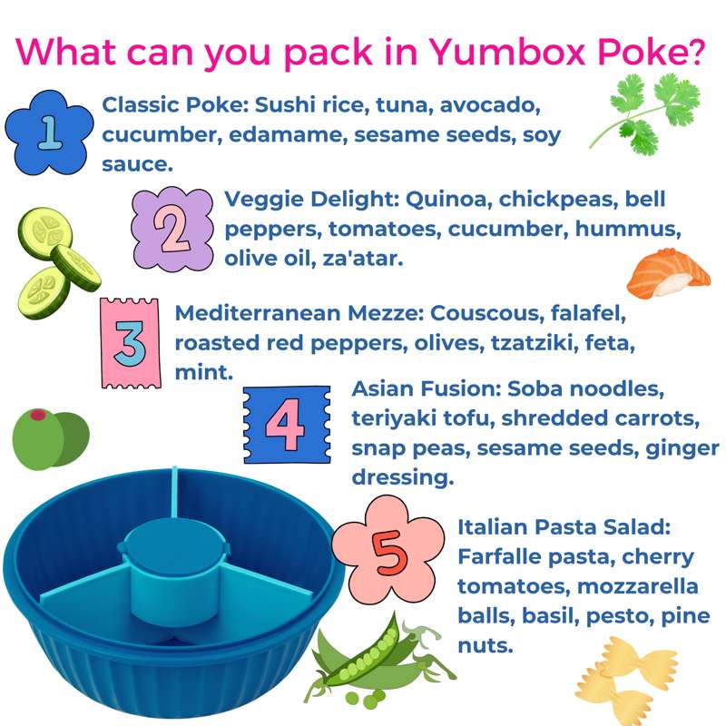 Oplev den innovative Yumbox Poke Love Bowl: en praktisk og alsidig madkasse, som er ideel til ubesværet at kombinere dine yndlingsingredienser til et lækkert måltid.