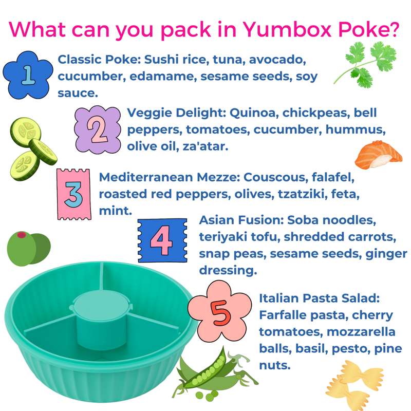 Oplev den innovative Yumbox Poke Love Bowl: en praktisk og alsidig madkasse, som er ideel til ubesværet at kombinere dine yndlingsingredienser til et lækkert måltid.